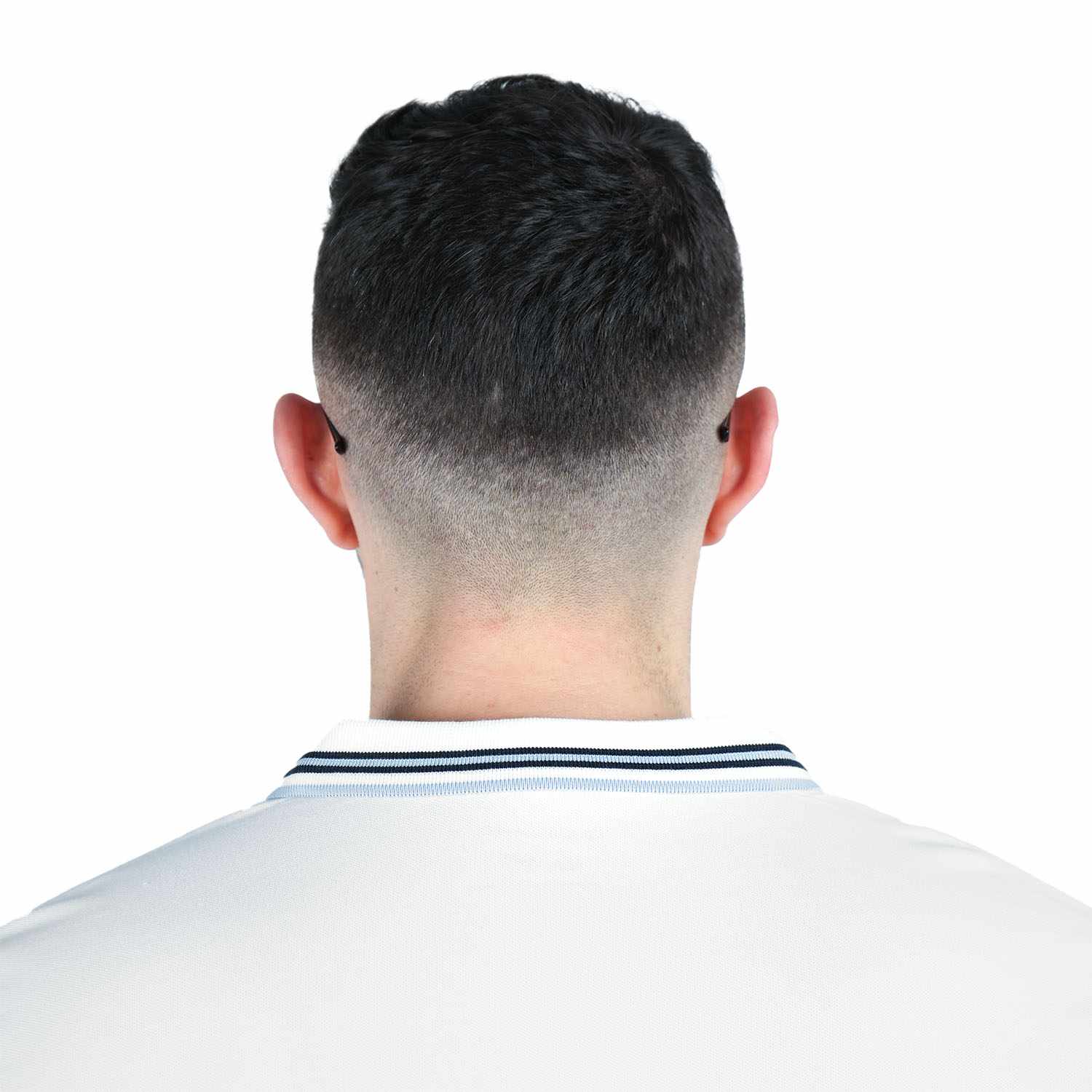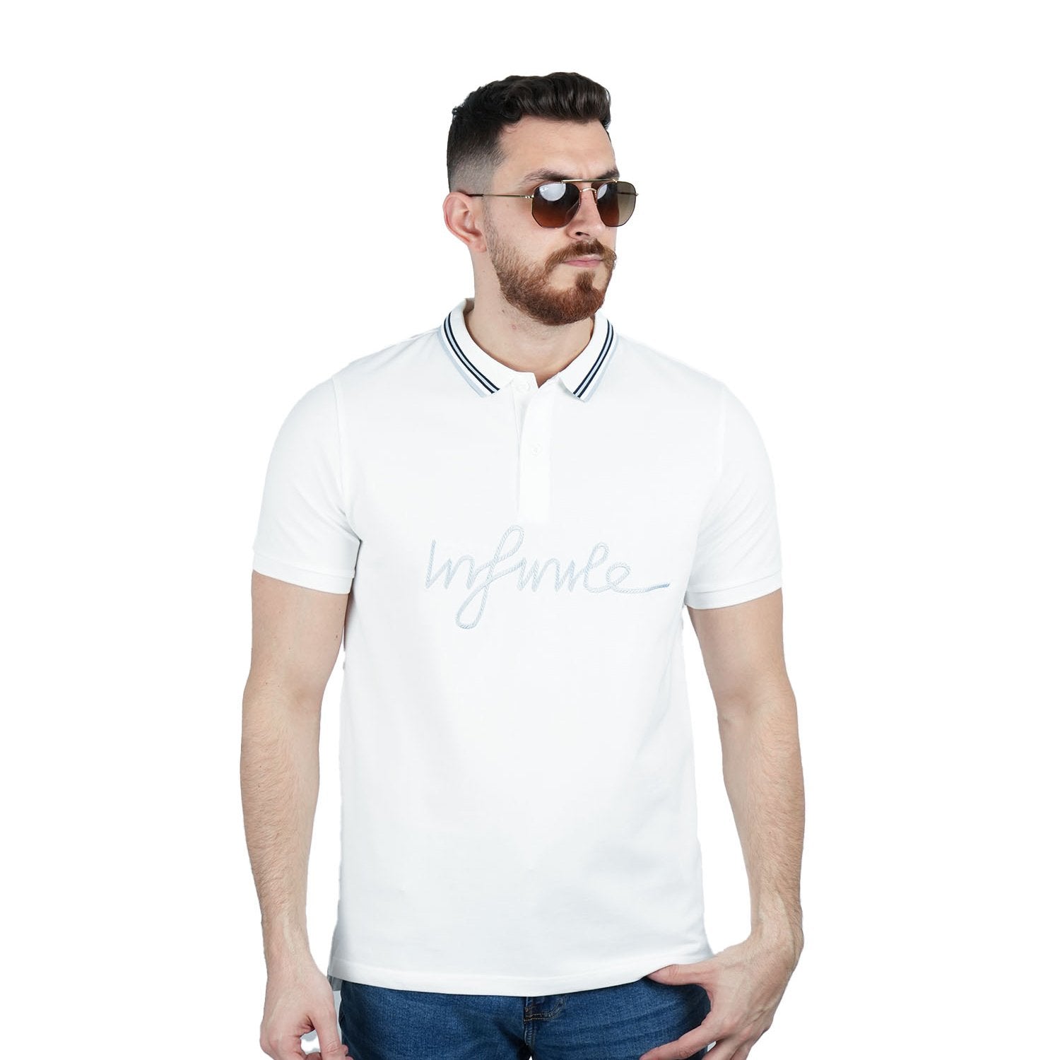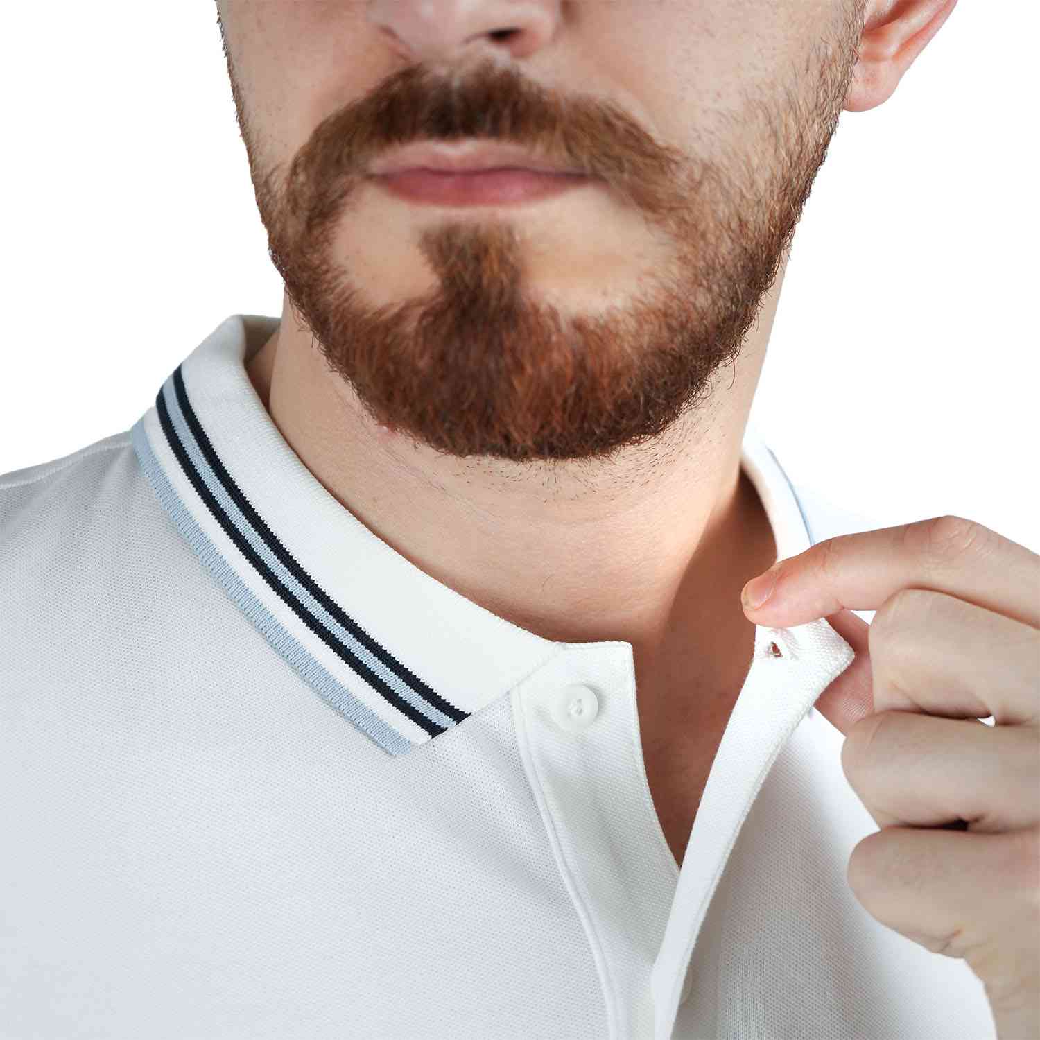 - This polo shirt is made from a pique knit fabric composed of 97% cotton and 3% Lycra (elastane) It features a flat knit collar, short sleeves, and a slim fit.