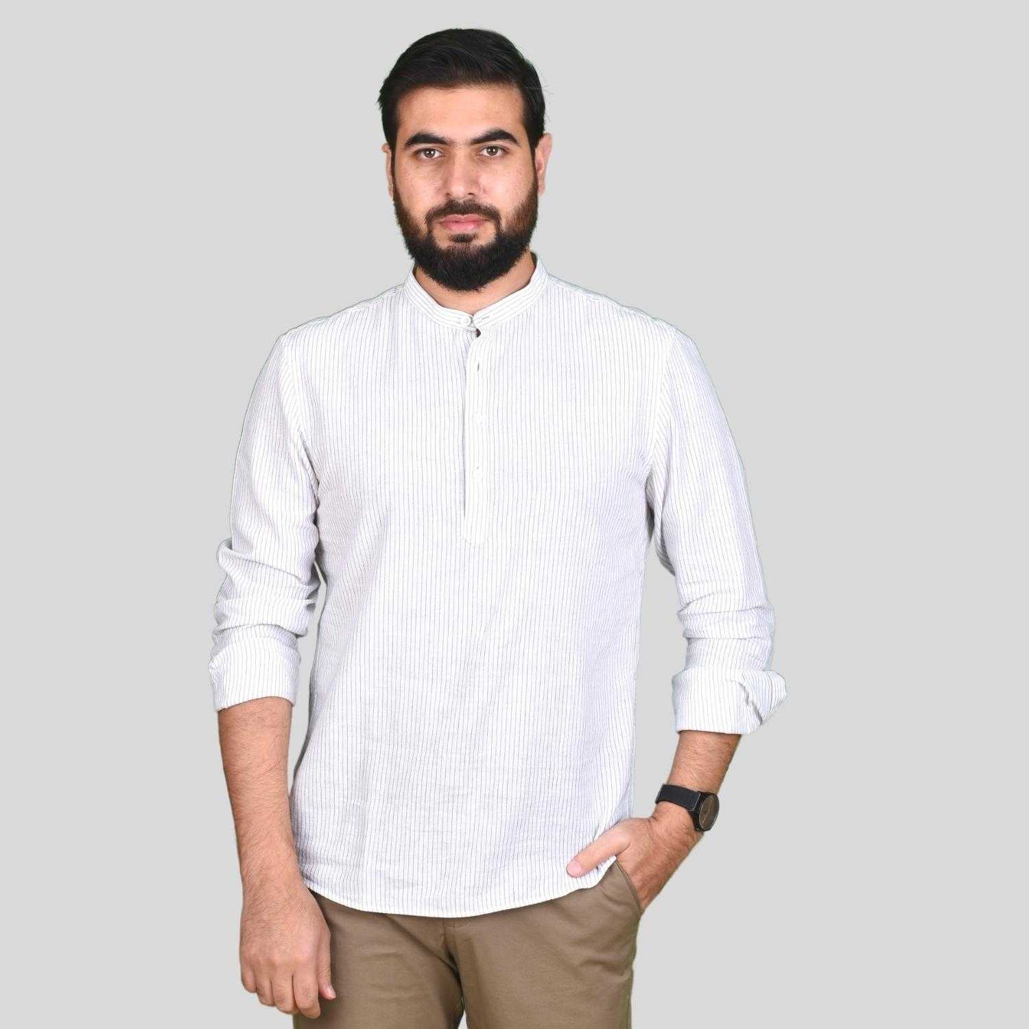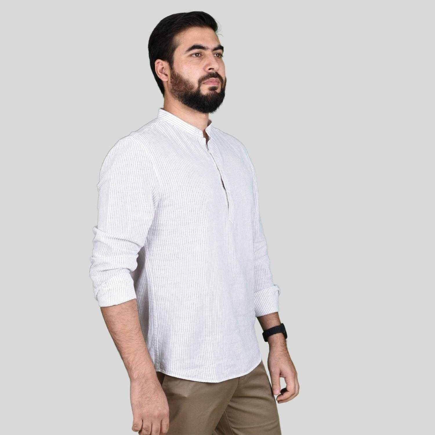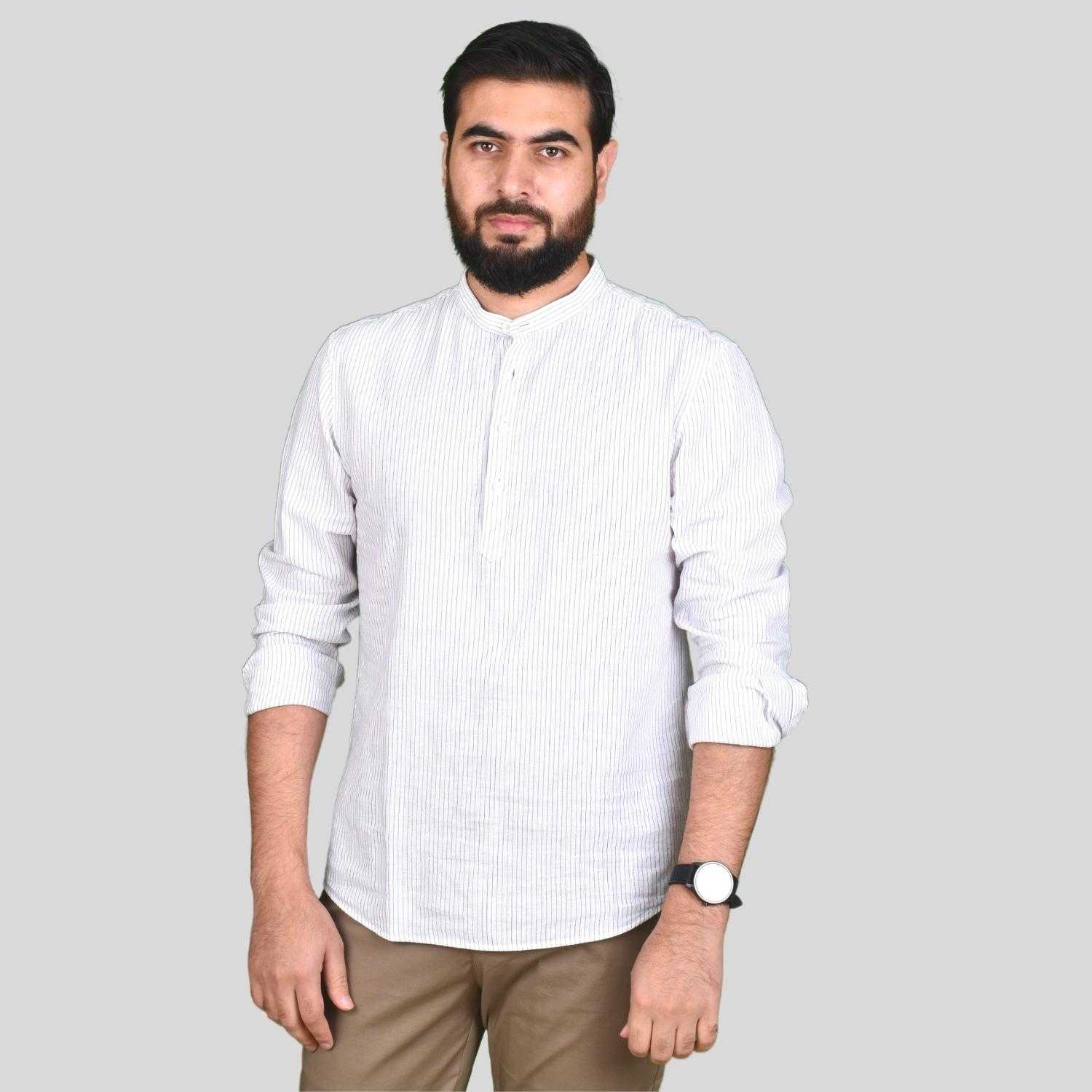 Natural linen cotton fabric enhances softness and comfort. Slim cutting. Comfortable stand collar design. Button front half placket. Long sleeves with double buttons at cuffs. Soft and comfortable.